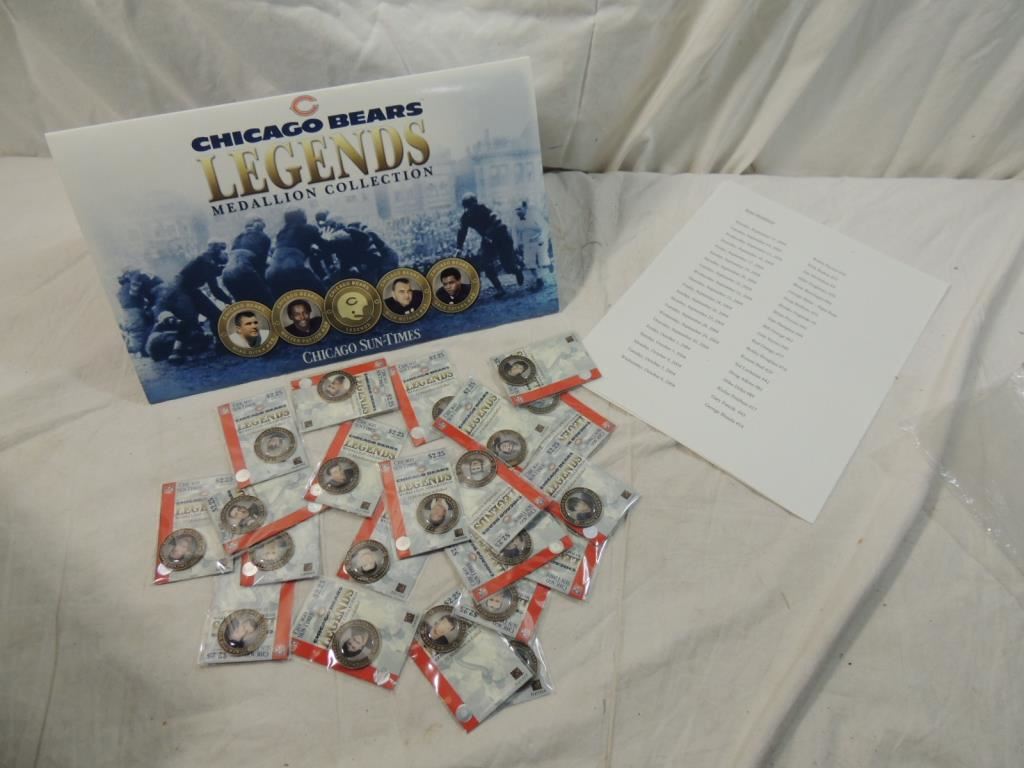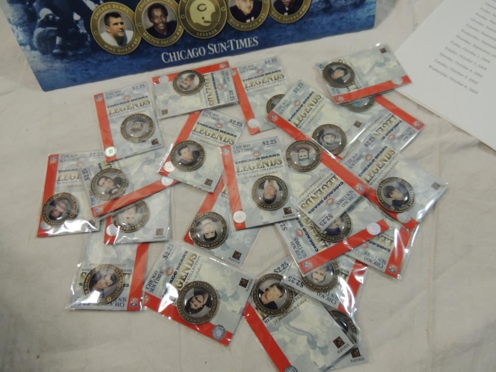 COMPLETE SET 21 PIECE SET CHICAGO SUN TIMES CHICAGO BEARS LEGENDS MEDALLION COLLECTION, DISPLAY SHEET AS SHOWN SEE PHOTO FOR MORE DETAILS.