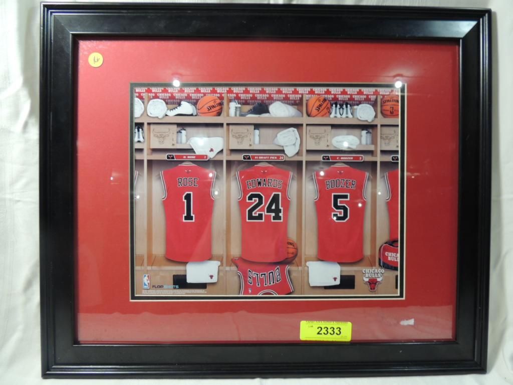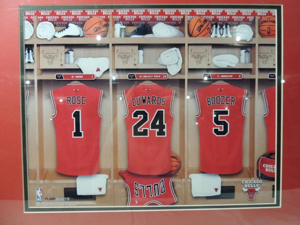 23" X 19" FRAMED CHICAGO BULLS ROSE, EDWARDS, AND BOOZER JERSEYS IN LOCKER ROOM PICTURE