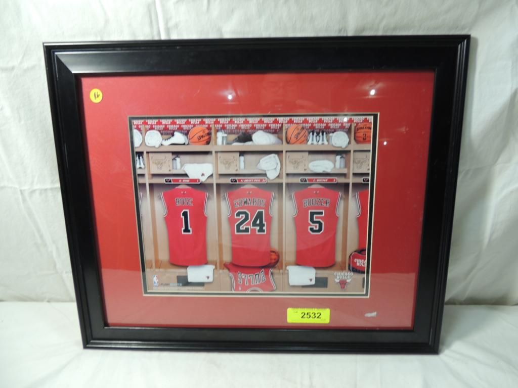 23" X 19" FRAMED CHICAGO BULLS ROSE, EDWARDS, AND BOOZER JERSEYS IN LOCKER ROOM PICTURE