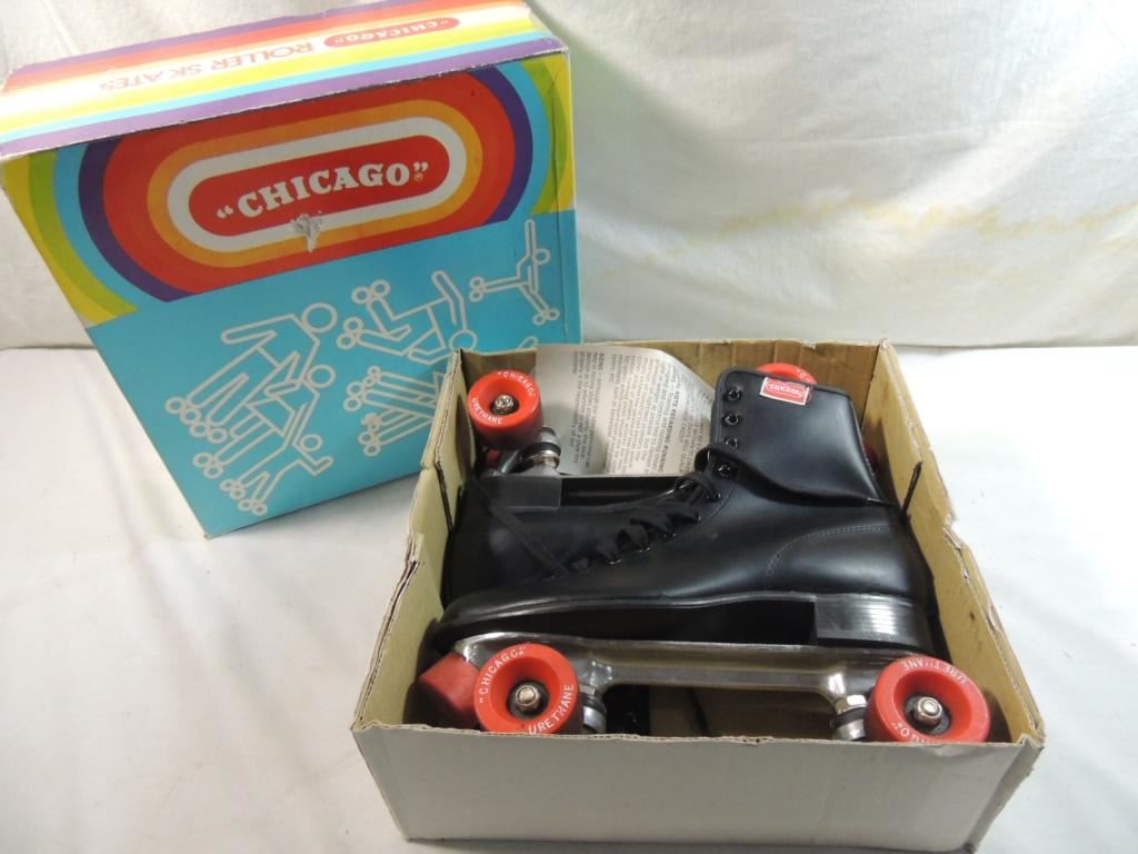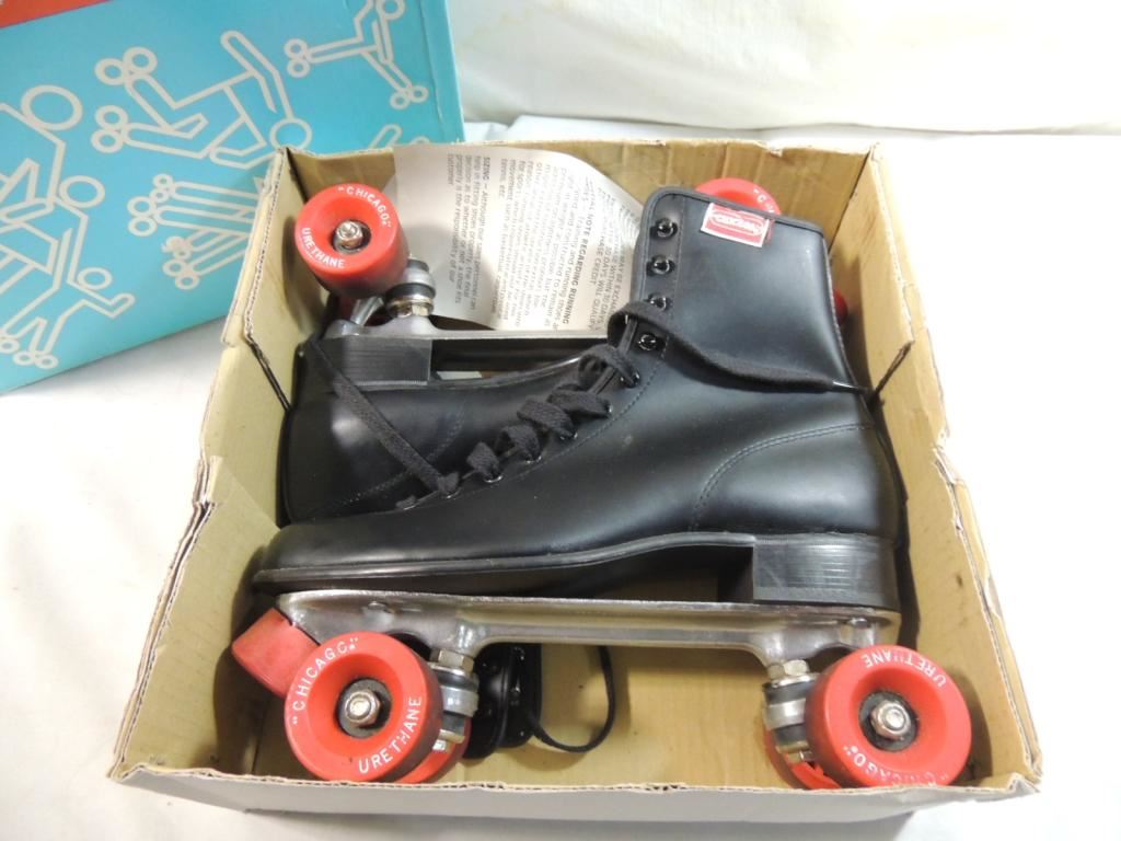 VINTAGE CHICAGO MENS ROLLER SKATES LIGHT WEIGHT STRENGTH AND COMFORT, ALUMINUM PLATES WITH DOUBLE ACTION URETHANE WHEELS AND TOE STOP SAFETY LOCK NUTS AS SHOWN SEE PHOTO FOR MORE DETAILS.