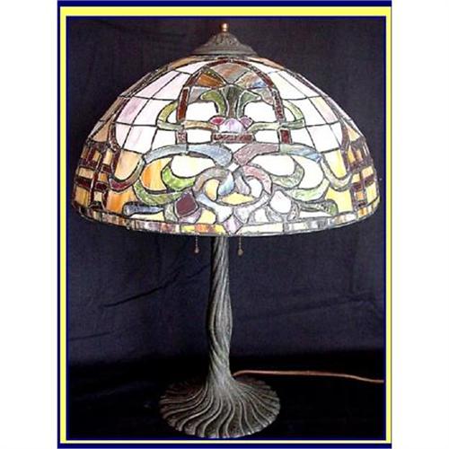 Signed Chicago Mosaic leaded glass lamp, dating to the early part of the 20th century and made in the USA.<BR>Approx 22 1/4inches high. Diam of shade is just over 16inches.<BR>Wonderful lead glass design in bright colours with slight Middle Eastern / Persian theme, popular in the early 20th century.<BR>The base is in the form of a tree. Scalloped round base with folds further embellished with flowers. Twists and turns in elegant Art Nouveau style.<BR>The base is signed underneath - embossed Chicago Mosaic mark. <BR>Condition is good with clear signs of welding on the inside - perhaps redone after years of natural shrinkage, but not noticeable in any way on the outside.