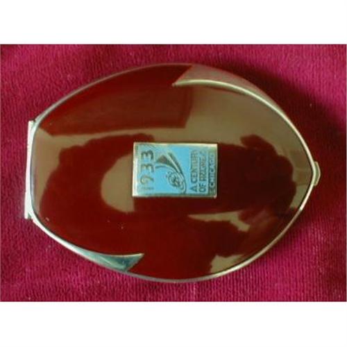 maroon enamel with chrome. Century of Progress logo in blue on top. Inside is a mirror and