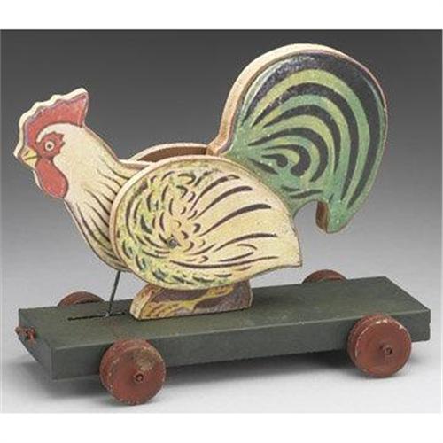 Brand new, made to look like its antiqued, CHICKEN ON WHEELS PULL TOY -- Dimensions: 8.5"h, 10.5"w, 4.5"d