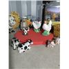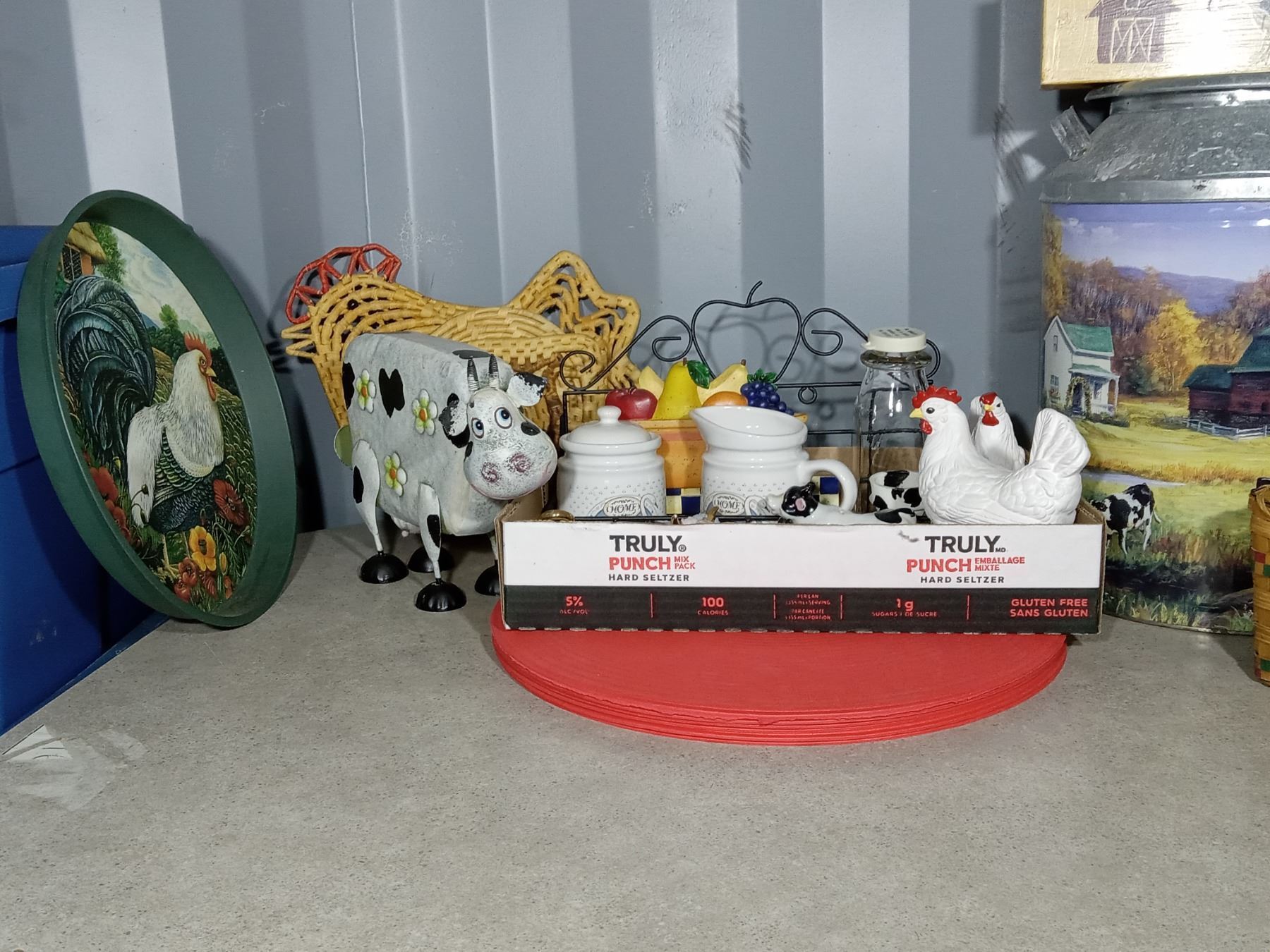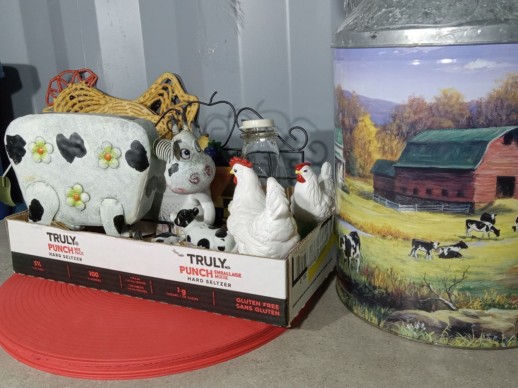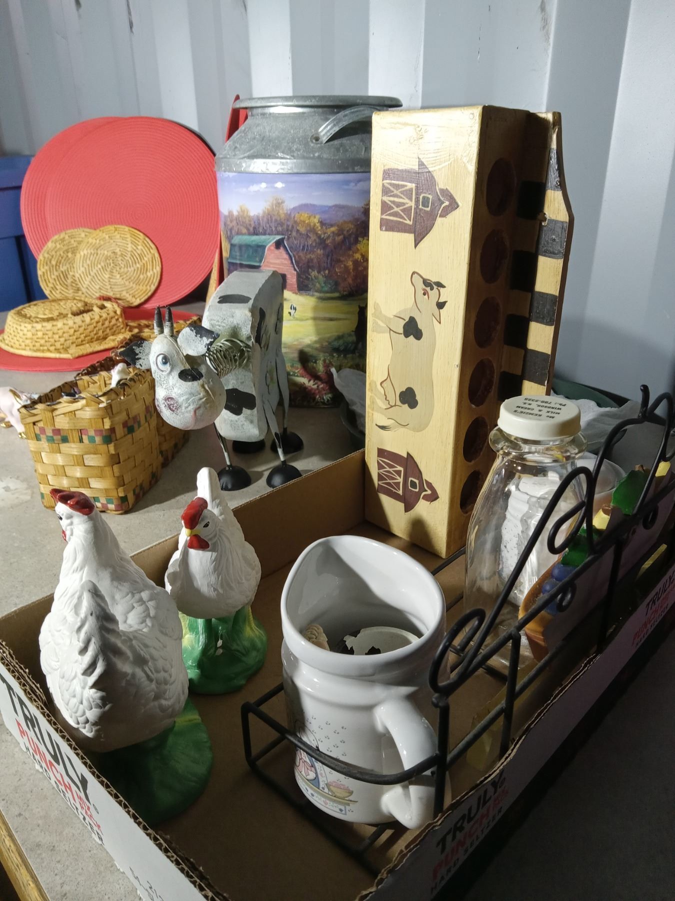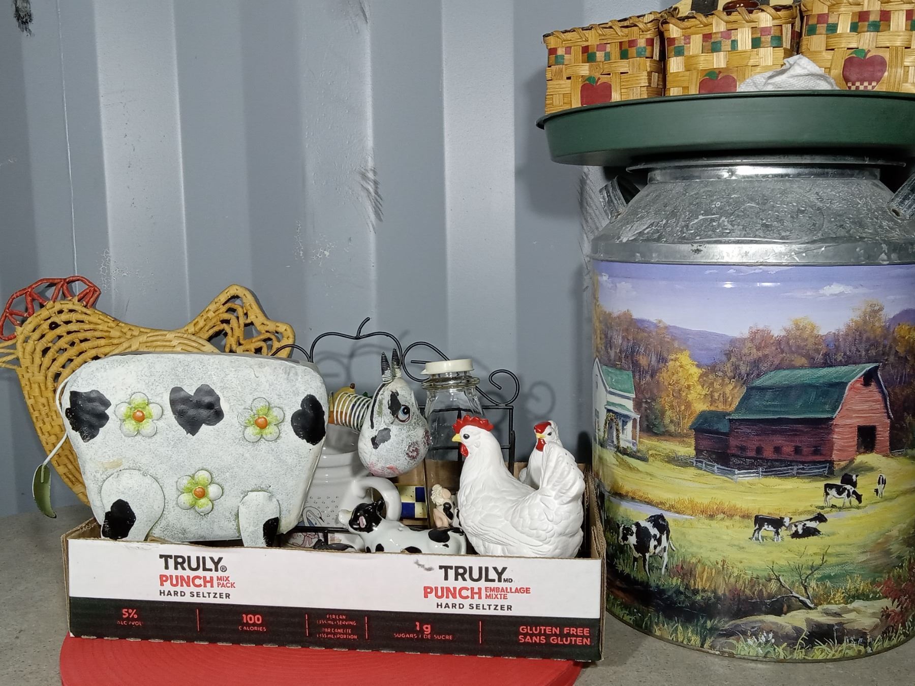 CHICKENS, COWS & ROOSTER Decorations c/w LARGE TIN Incl/s: Large Assortment of culinary content.
