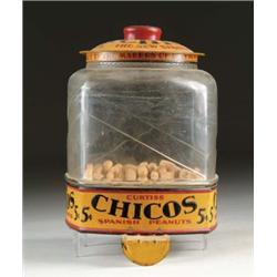 CHICOS PEANUTS STORE JAR. Shelf display jar for the Curtiss Co.’s Chicos Spanish peanuts. Complete with tin lid and embossed tin base. SIZE: 8” w. x 11” t. x 8” d. CONDITION: Very good, both the tin lid and base retain great paint. PF 1-3663 (200-300)