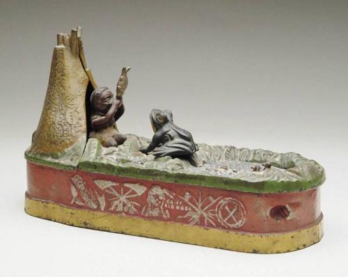 CHIEF BIG MOON MECHANICAL BANK. Place a coin in the slot to the front of fish's tail. When lever is operated the large frog springs from under the lake towards the fish. The squaw lifts fish up and away from the frog and the coin is deposited. This is the scarcer red base version of this bank. SIZE: 10" l. CONDITION: Bank is in excellent condition, with minor chipping to base and little wear on the high points. Missing trap. A superior example. 1-5254 MC