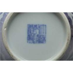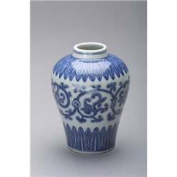 Very fine and small Chinese, 18th Century, blue and white porcelain meiping with finely detailed central scrolling foliage band bordered by plantain leaf bands, Ch'ien Lung mark and of the period; H: 5 1/2"