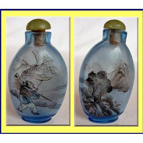 Antique Chinese snuff bottle made of blue glass and internatlly painted on both sides. Jade stopper. Chien-lung.