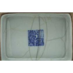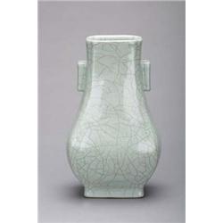 Fine and rare Chinese 18th Century, Ch'ien Lung mark and of the period, kuan-type glazed porcelain hu-form vase with two square-form handles (repaired rim chip and minor hairline to base); H: 12 1/8"; wood stand
