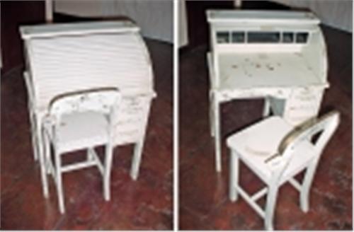 CHILD ROLL TOP DESK WITH CHAIR HANDPAINTED DATED 1962. 33" X 23" 17" DEEP WITH ROLLTOP AND CUBBIES,