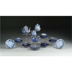 CHILD'S BLUE SPONGEWARE TEA SET. Service for six. Set includes covered teapot, open creamer, covered sugar and serving bowl. Six dinner plates, five cups and six saucers. Beautiful cobalt blue decoration. Attractive set. SIZE: Varies. CONDITION: One tea cup missing, regluing to two pieces, otherwise clean and bright. WP 1-3200 (350-550)