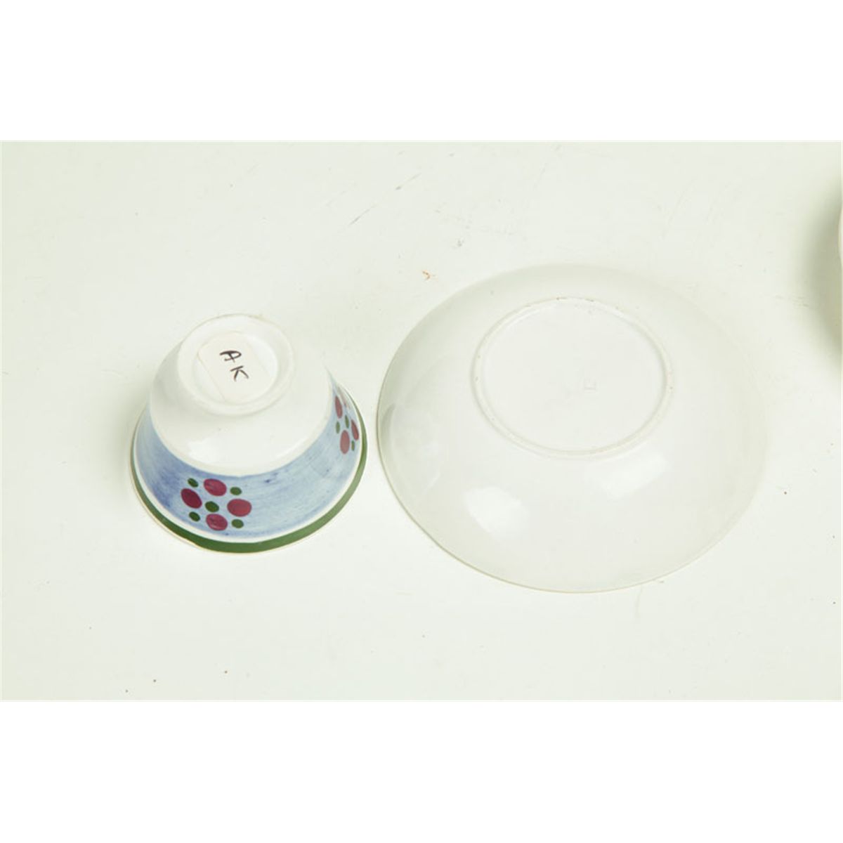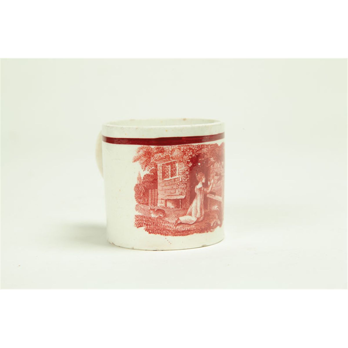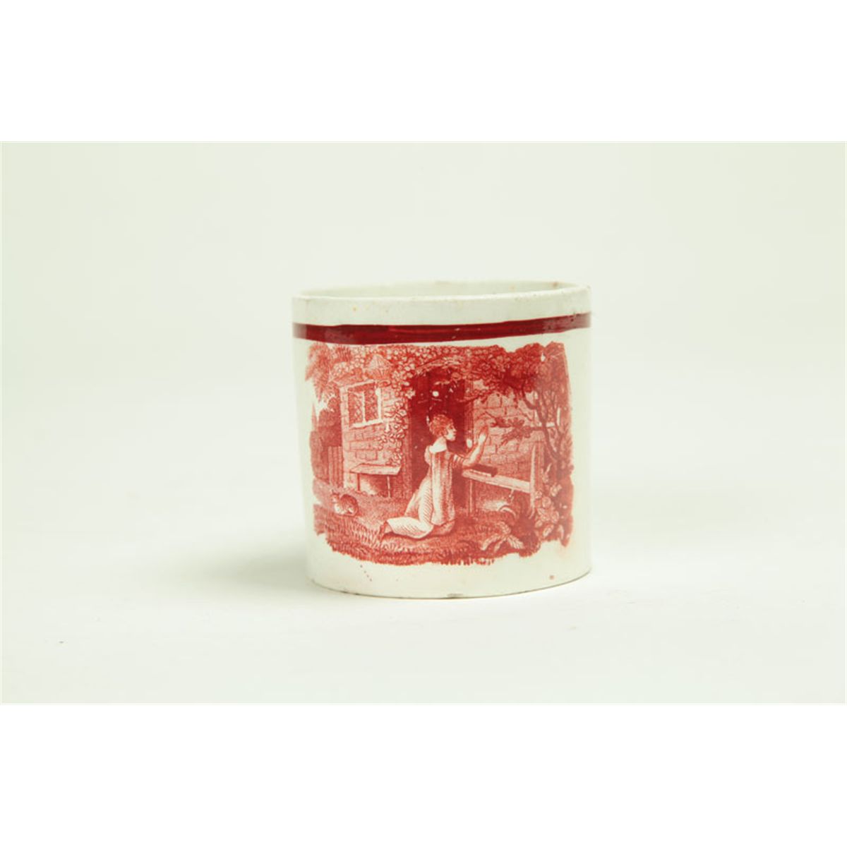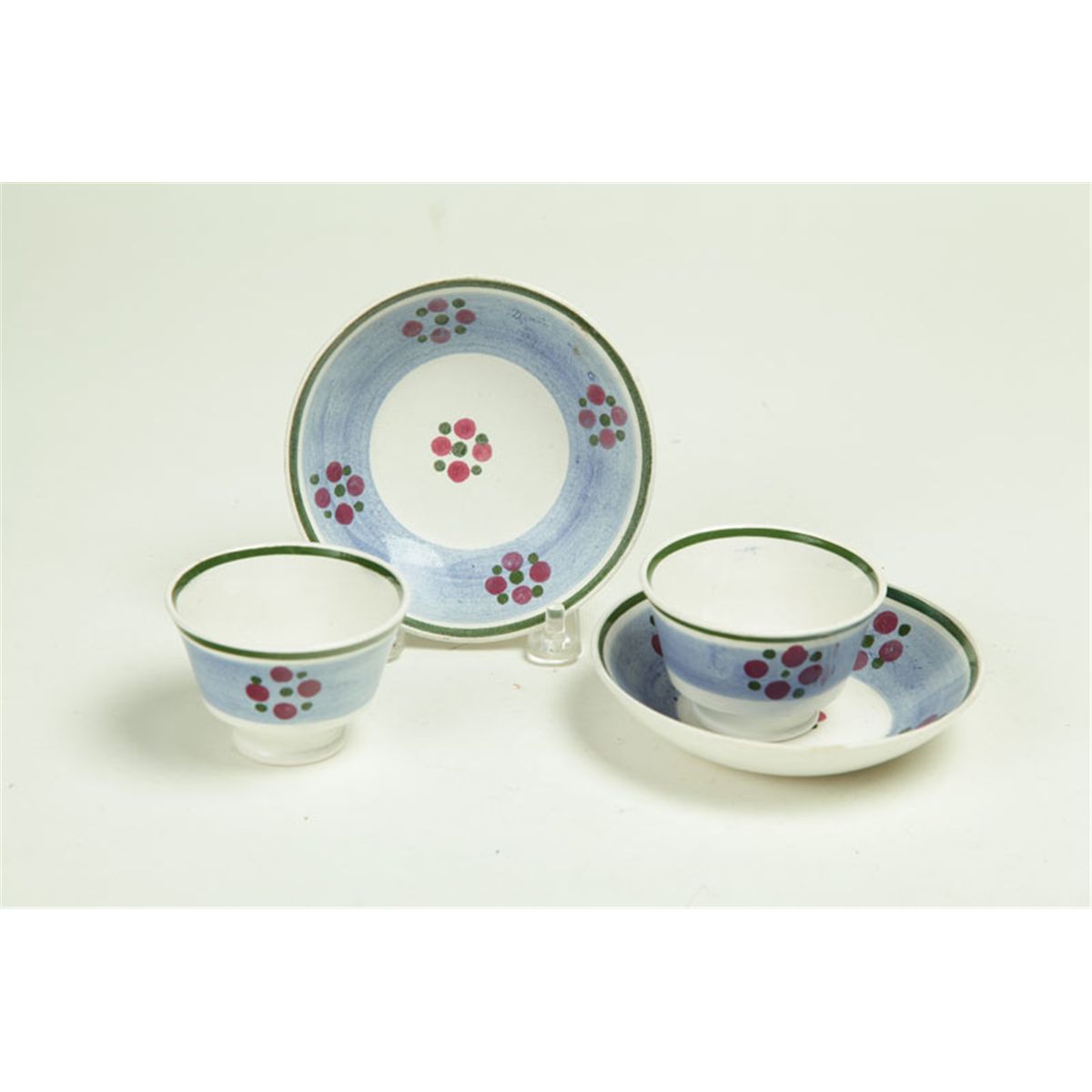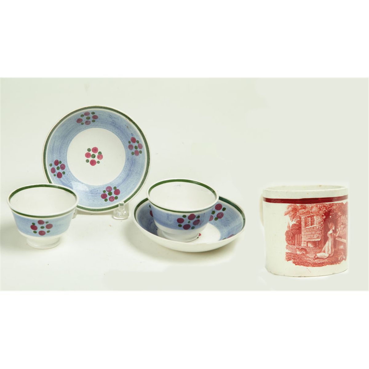England, 1st half-19th century, pearlware. Pair of handleless cups and saucers with red and green dots on a blue stripe and a Staffordshire cup with red transfer-printed scene with a young girl and her cat. Foot flakes. 2 1/2"h.