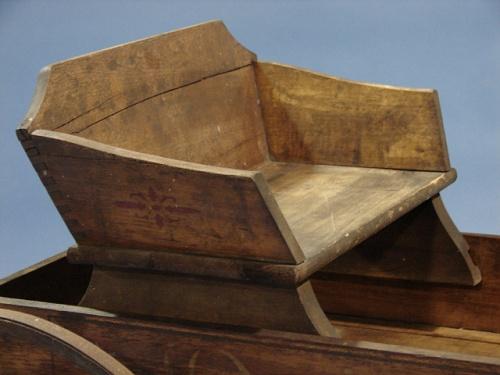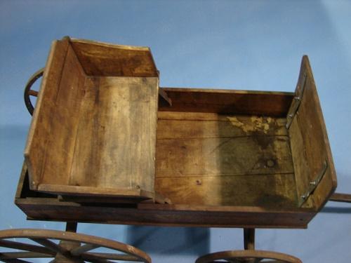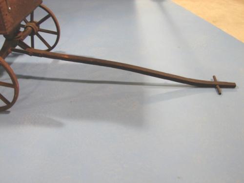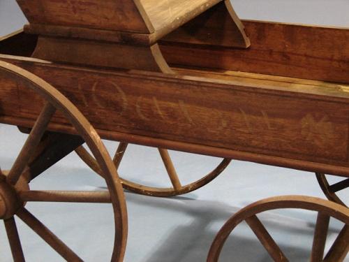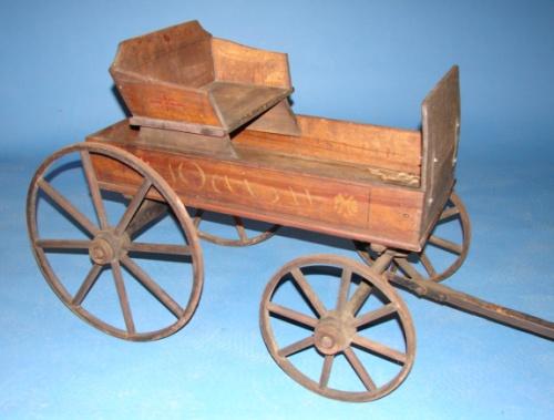 CHILD’S DAISY BUCKBOARD WAGON. Wooden spoke wheels. Rabbit tail construction. Shows stencil decoration and is marked “Daisy” at both sides. Wagon: 24” H, 26” L, 14” W. Tongue: 35” L