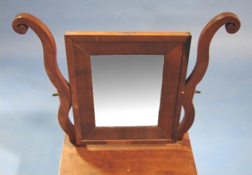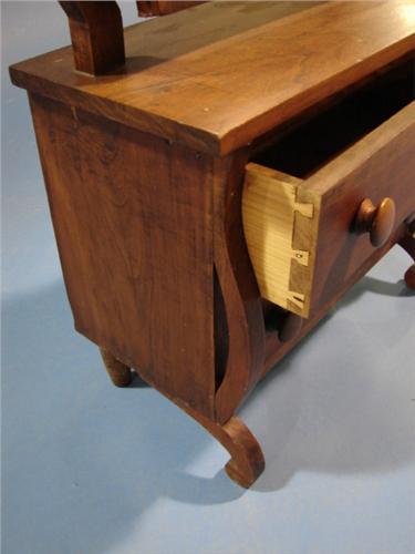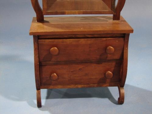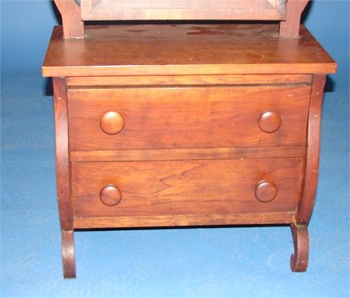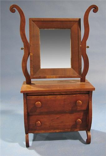 CHILD’S EMPIRE WALNUT CHEST. Has two dovetailed drawers with mirror at top. 35” H, 17.5” W, 8.5” D
