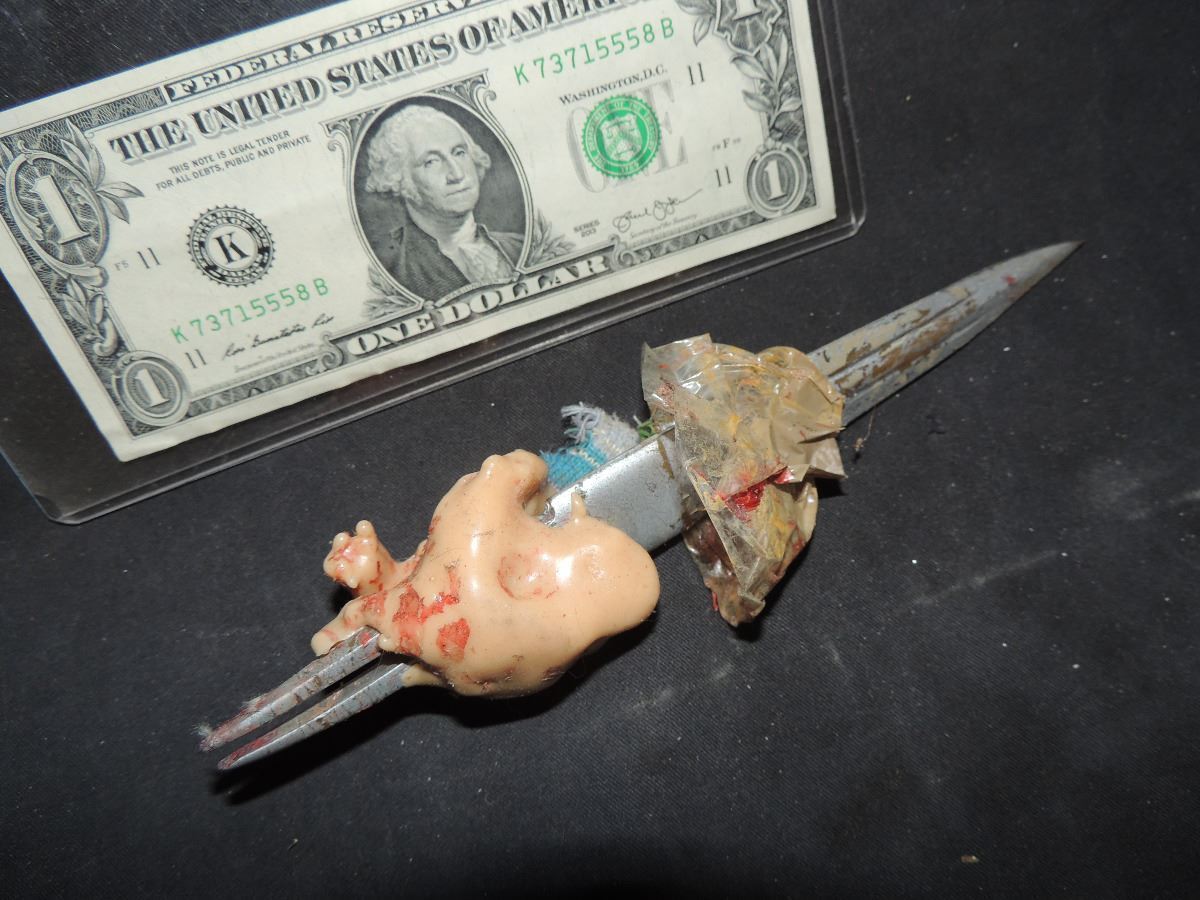 This is the rubber knife blade with Silicone flesh, tape, and a swatch of shirt fabric still attached from CHILD'S PLAY 2! This the one you see in CHUCKY'S arm.