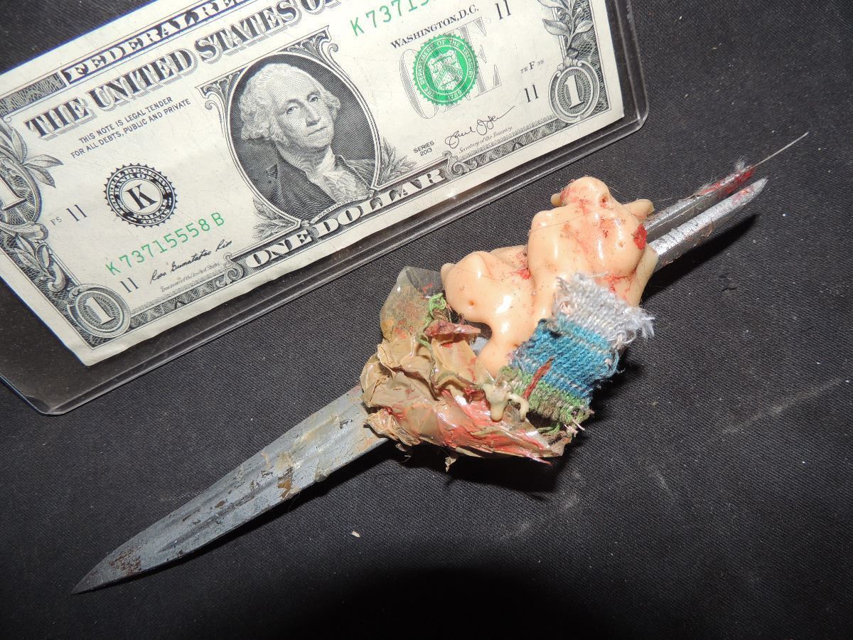 This is the rubber knife blade with Silicone flesh, tape, and a swatch of shirt fabric still attached from CHILD'S PLAY 2! This the one you see in CHUCKY'S arm.