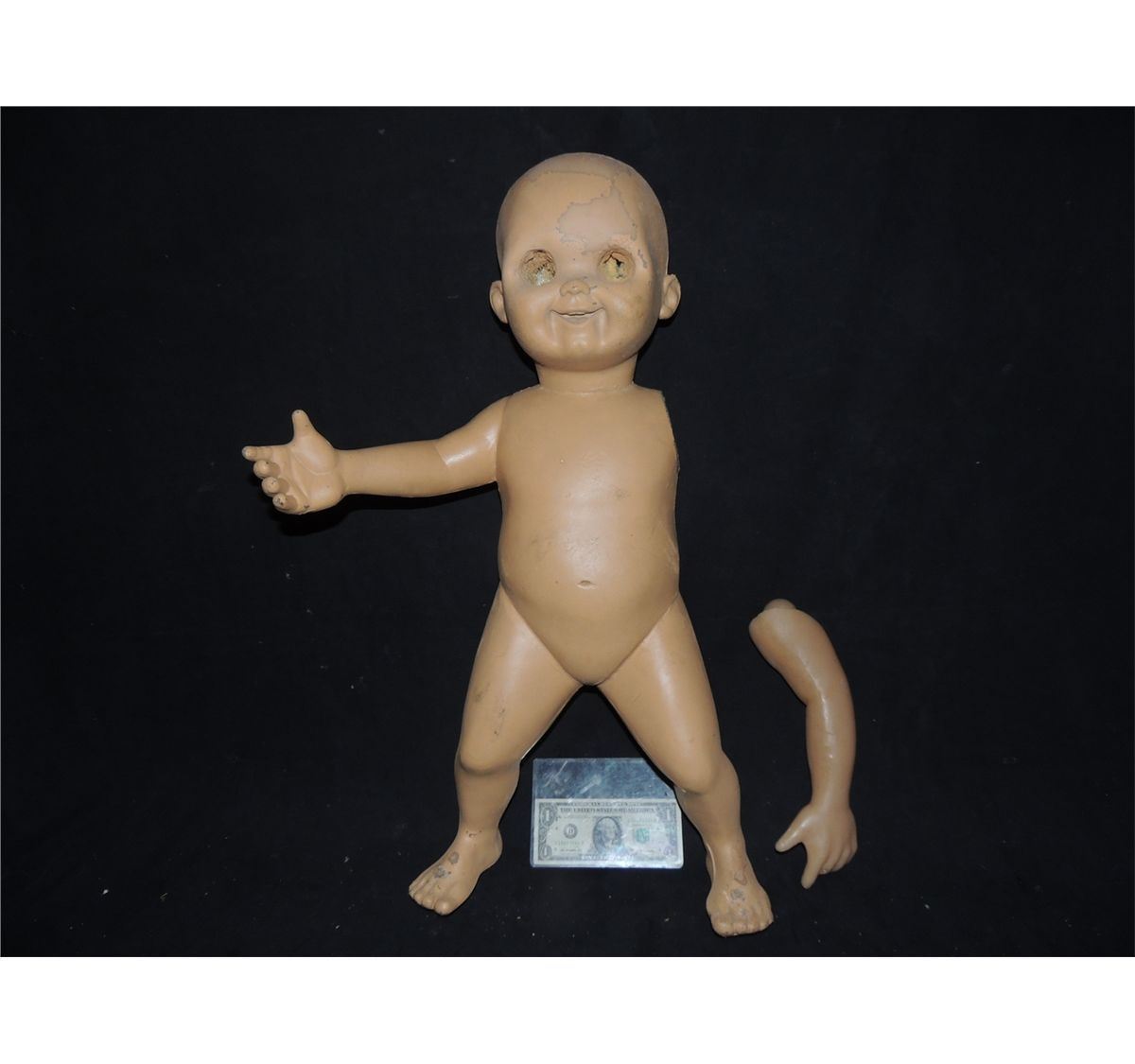 This is one of the Screen Used Good Guys Dolls seen in the factory scenes at the end of CHILD'S PLAY 2. Several different types of dolls were made, but only a few of these. This particular one can be screen matched because it is the one that falls off the assembly line when it gets jammed up. That is when the arm broke off. As you can see, I have now obtained an original arm to complete this doll. Which was not easy! It is a miracle that this even exists at all!