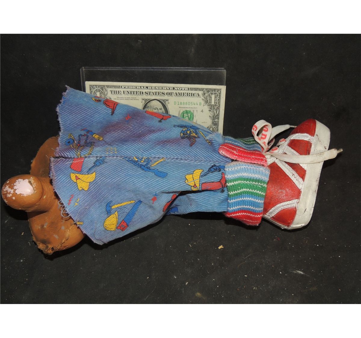 The leg itself is from part 1, the shoe is from part 2, the Good Guys lace is from part 3, the sock is from Bride, and the pant leg saturated in Chucky's blood is from Seed.