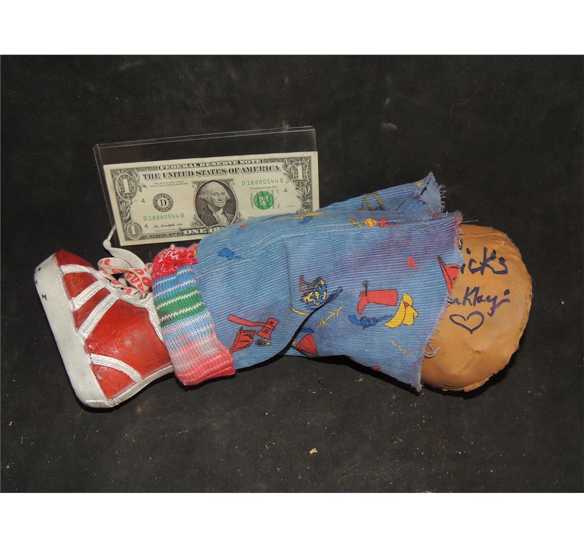 This is the only piece in CHILD'S PLAY history that has a prop from each of the 5 original films! It is also hand signed by stars Ed Gale and Katherine Hicks!