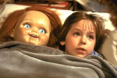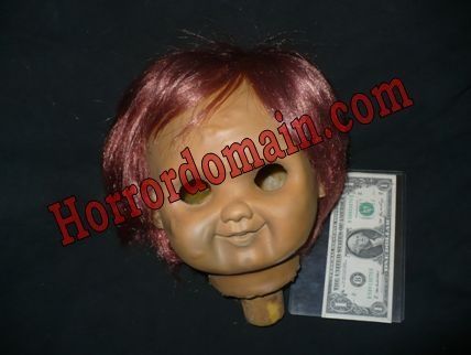 Incredibly cool Screen Used Hero Chucky head used in the first CHILD'S PLAY. Unlike the few factory scene dolls and supposed stunt heads floating around with cast in painted eyes, these eyes are open, and this head is hollow and semi rigid. Though the eyes have been removed since, I believe this may be all that remains of one of the original Good Guy dolls. The paint has darkened with age, but you can still barely see the eyebrows, eyelashes, and freckles in person.