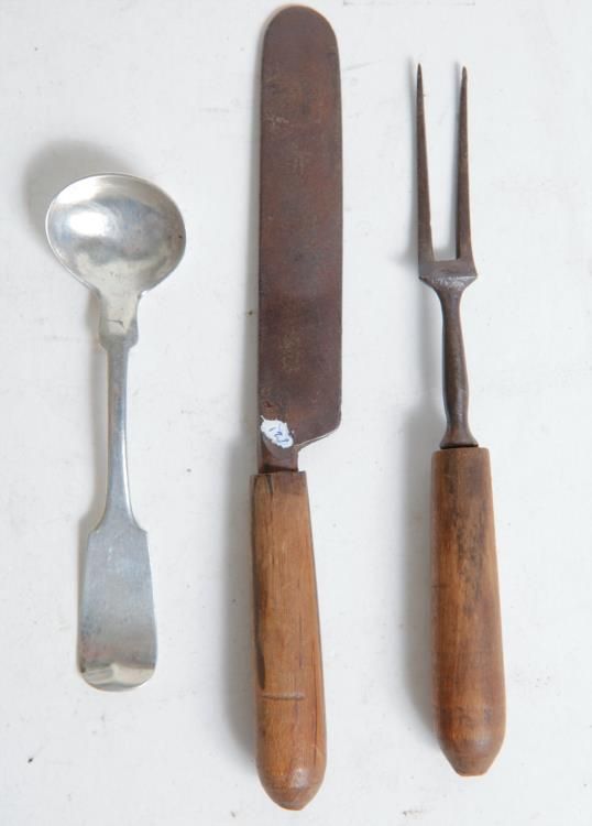 CHILD'S REVOLUTIONARY WAR ERA 2 PRONG FORK AND KNIFE, AS WELL AS TURN OF THE CENTURY CHILDREN'S SPOONKnife measures 5.75" in length, fork measures 5.1" in length, and spoon measures 3.6" in length.