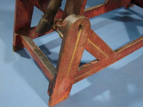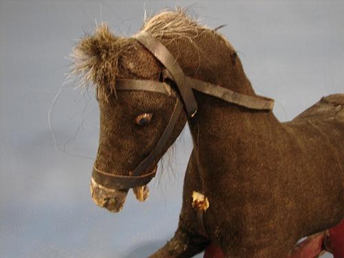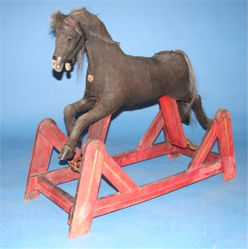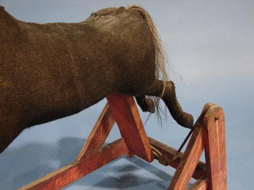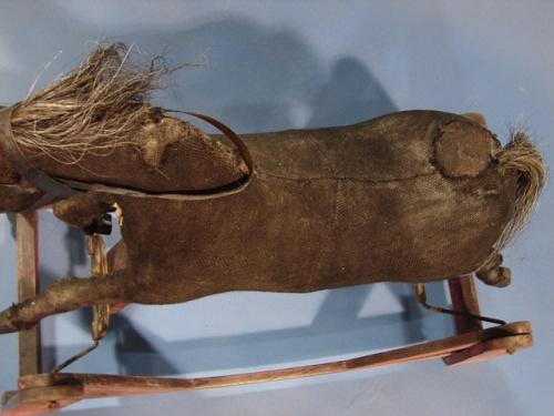 CHILD’S ROCKING HORSE. Red painted and yellow stenciled cradle. Straw filled horse with wooden hooves and glass e. Horse shows wear to body. 27.5” H, 31” L, 13” W