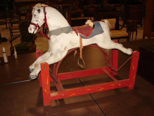 PRIMITIVE CHILD'S ROCKING HORSE. Wooden white painted horse swings or wooden base with red paint and yellow stenciling. Horse and base show signs of wear. 30" H, 36" L
