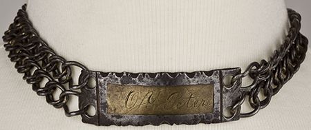 Extremely rare hand-forged slave collar, ca. 1840’s, approximately 18” in length and likely used on a child on a plantation. The collar is composed of two strands of approx. 1/4" links on either side of a 2 3/8" scallop-edged plate with brass insert upon which the slave's name O. Y. Peter" has been engraved in period lettering. A hasp with lock is present into which fits a sleeve found at the other end of the collar. That sleeve bears five holes through which a round locking pin would fit. A key is present which operates a screw-type locking pin, still operable. The length of this collar indicates it was likely used on a teenage or larger child. Although various shackles and collars for adult slaves are commonly seen, those used on children are seldom offered. From a private collection emanating from Beaufort, SC.