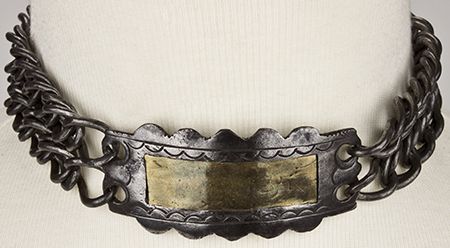 Extremely rare hand-forged slave collar, ca. 1840’s, approximately 14 3/4” in length and likely used on a child on a plantation. The collar is composed of two strands of approx. 1/2" links on either side of a 2 1/2" scallop-edged plate with brass insert upon which the salve's name was to be engraved - this example is either unused or the engraving has been worn-off. A hasp with lock is present into which is fitted a sleeve with several holes, found at the other end of the collar. A screw-type locking pin fits into these holes which still show obvious signs of prolonged use. A key is present, though it may be mismatched. Slave children were not as readily identifiable as their adult counterparts, hence the identifying collars. Although various shackles and collars for adult slaves are commonly seen, those used on children are seldom offered. From a private collection emanating from Beaufort, SC.