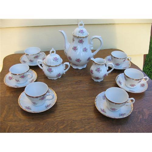 TEA POT IS 5.5" WITHOUT LID, CREAMER 3", SUGAR IS 2.5" WITHOUT LID. SET ALSO INCLUDES SIX CUPS (2" HIGH)AND SAUCERS ALL IN MINT CONDITION. GORGEOUS AND UNUSUAL TO FIND IN THIS PRISTINE CONDITION!