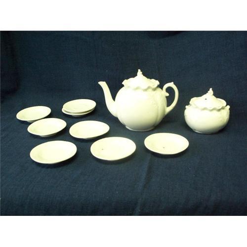This child's tea set is made of German porcelain and consists of: ten small plates, 5 cups and saucers, (one cup is cracked), one larger plate, 3 extra saucers, the teapot (which has a small chip in the fluted rim) and sugar bowl. Four (4) of the cups have a painted leaf design on them. On the edge of the dishes is a swirl pattern. The teapot and sugar have a more elaborate raised design.