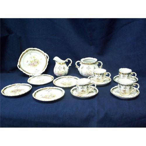 Elegant 15 pieces of a child's tea set to include 4 cups, 4 saucers, 4 plates, 1 serving plate, creamer and sugar(lid missing). There is a floral design and heavy gold trim on all of the pieces. There is no back stamp on any of the pieces to indicate a manufacturer, however, they are vintage and have a strong appearance of quality. There are few signs of wear or use.