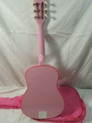 COMPLETE WITH INTACT STRINGS. WOOD BODY. INCLUDES MATCHING PINK CASE, TOO. AS SHOWN.