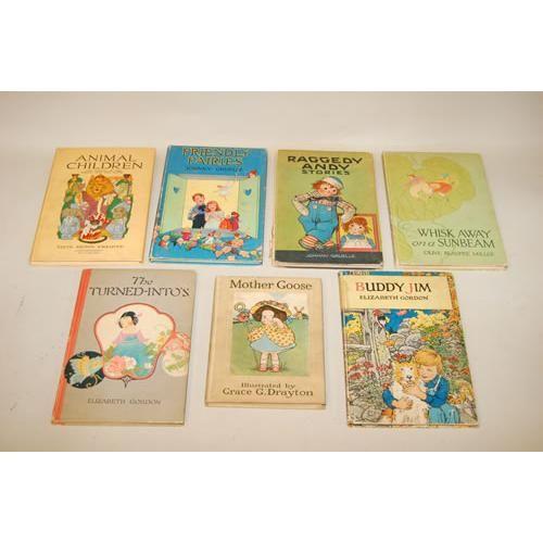 CHILDREN'S ILLUSTRATED. A Group of 7 Volumes as Listed. 8vo - over 7¾" - 9¾" tall. Hard Cover. Good Condition. NOT EX-LIBRARY. ***Nursery Rhymes From Mother Goose, ills by Grace G. Drayton (1916) NY: Charles Scribner's Sons. Color frontis with color & b/w ills throughout, illustrated paper label on front cover, foxing on prelims, owners name on ffp, musty, covers darkened. Binding & hinges tight. ***Raggedy Andy Stories, Introducing the Little Rag, Brother of Raggedy Ann, written and ills by Johnny Gruelle (1920) 29th edition, NY: P.F. Volland Co. Color ills throughout, glossy paper, fingerprints on pages, lacks backstrip, binding & hinges tight. ***Whisk Away on a Sunbeam by Olive Beaupre Miller, ills by Maginel Wright Enright (1919) NY: P.F. Volland Co. Color ills throughout, glossy paper, edge/corner wear, binding & hinges tight. ***Friendly Fairies, written & ills by Johnny Gruelle (1919) 17 edition, NY: P.F. Volland Co. Color ills throughout, glossy paper, light edge/corner wear, binding & hinges tight. ***Buddy Jim by Elizabeth Gordon, ills by John Ray (1922) NY: P.F. Volland Co. Color ills throughout, glossy paper, occasional fingerprint, corner/edge wear, binding & hinges tight. ***The Turned-Into's, Jane Elizabeth Discovers the Garden Folk by Elizabeth Gordon, ills by Janet Laura Scott (1920) NY: P.F. Volland Co. Color ills throughout, glossy paper, light corner/edge wear, binding & hinges tight. ***Animal Children, The Friends of the Forest and the Plain by Edith Brown Kirkwood, ills by M.T. Ross (1913) 28th edition, Chicago: P.F. Volland & Co. Color ills throughout, glossy paper, covers darkened, binding & hinges tight.