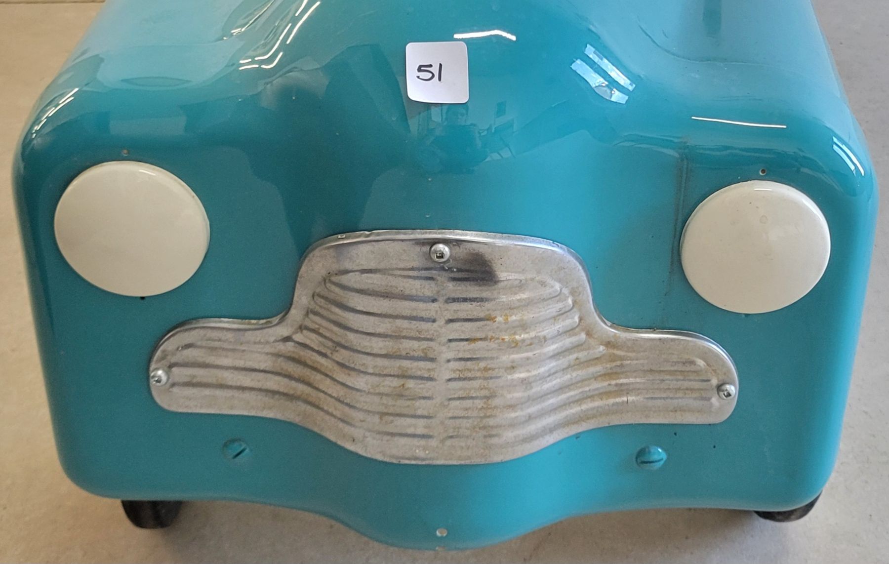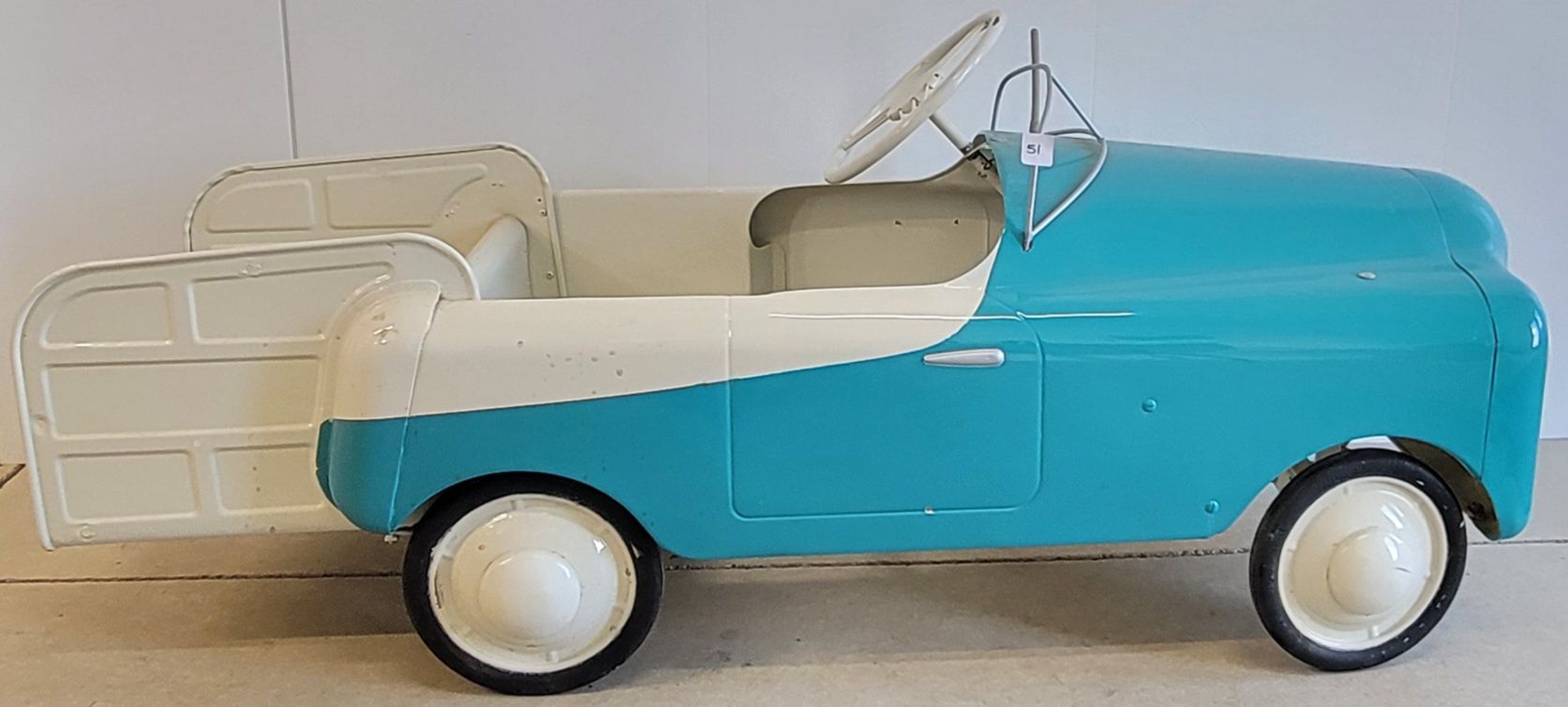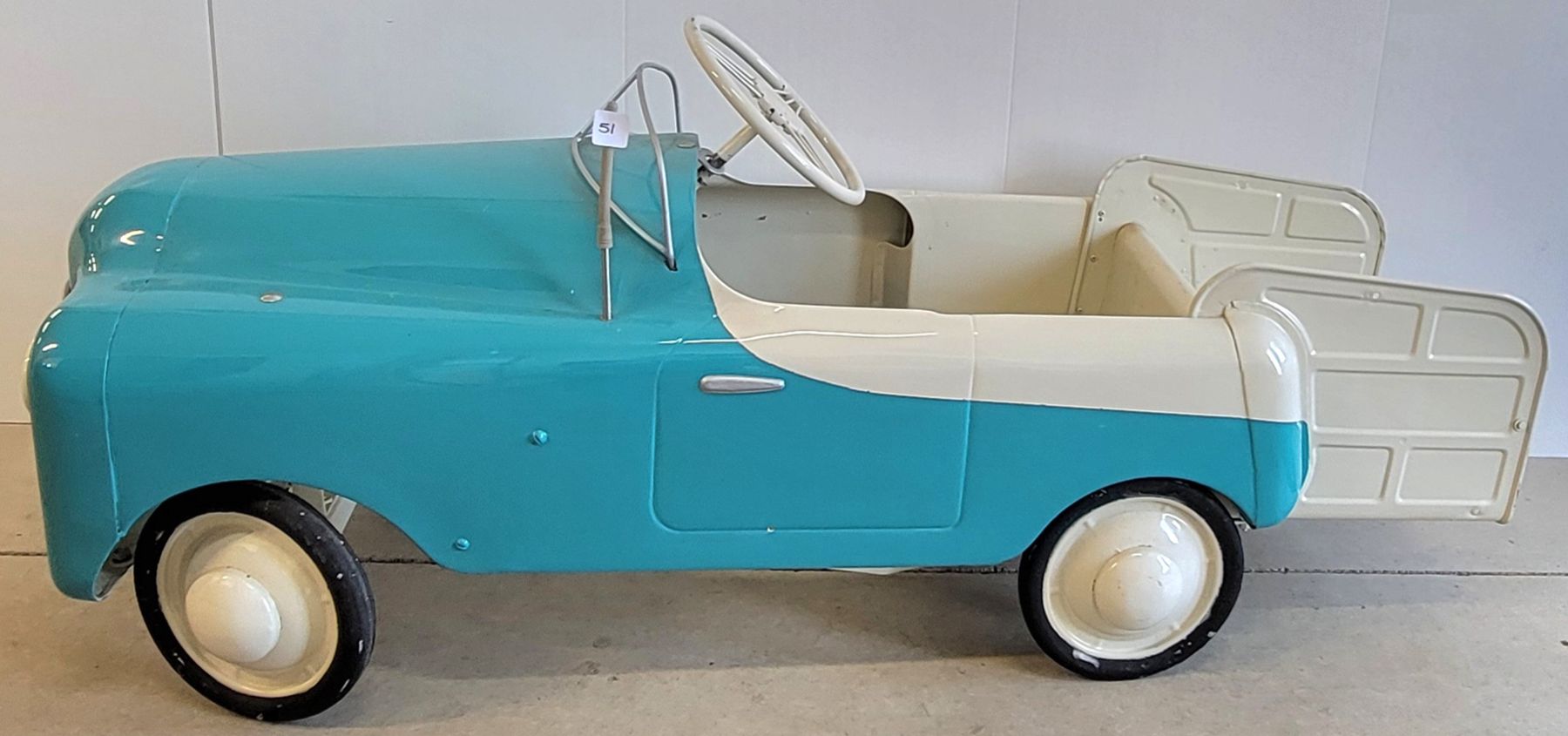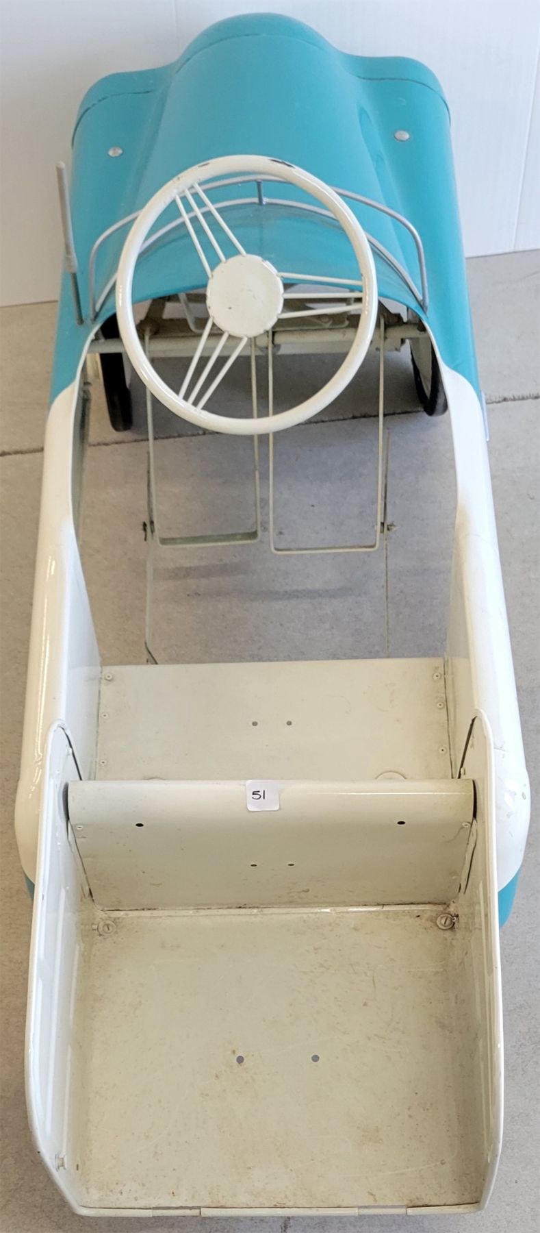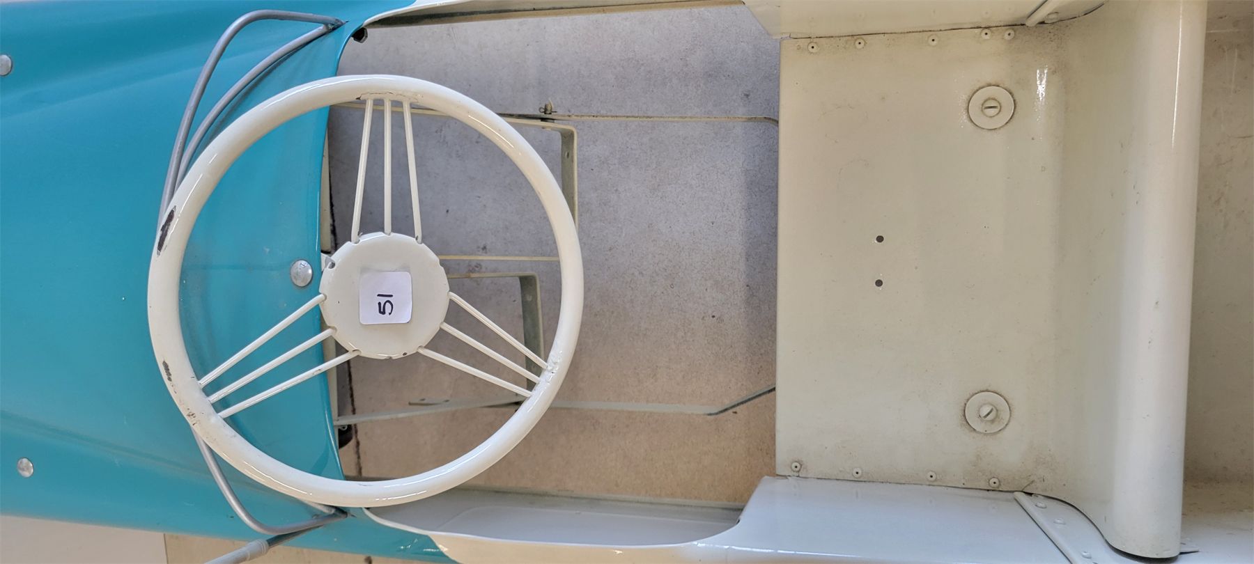 NOTE: APPROX 15 X 22 X 47IN - MARKED MADE IN ENGLAND - DISCWHEELS - CHIPPED PAINT ON STEERING WHEEL - SHIPPING TO BE ARRANGED BY BIDDER