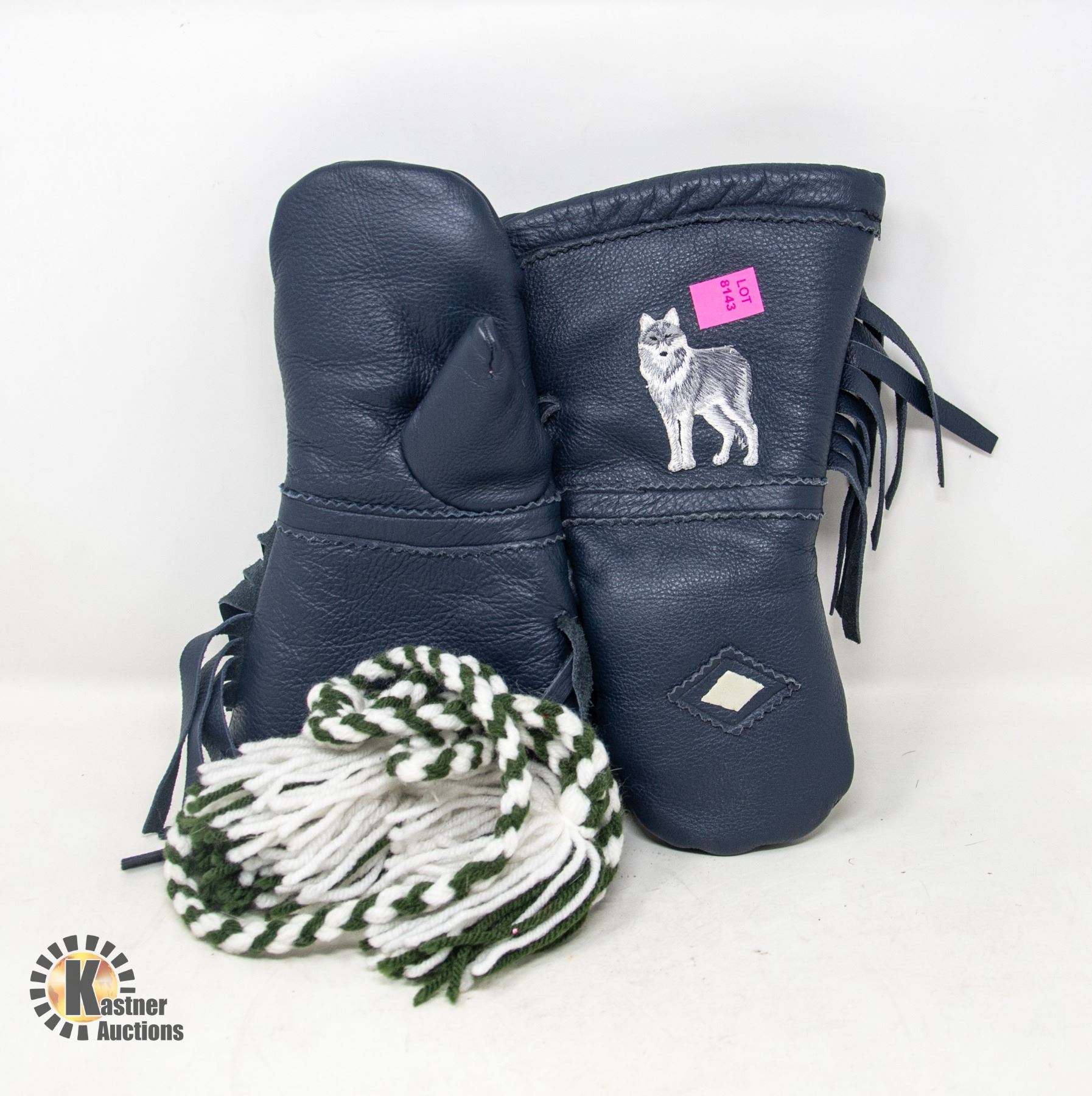 CHILDRENS HIDE LINED GLOVES; WOLF DESIGN