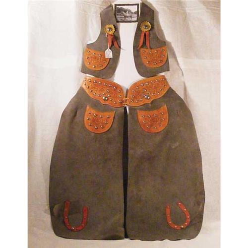 Child's chaps and vest with tooled leather and spot accents. Included is a picture of the child that wore this outfit back in the 50's