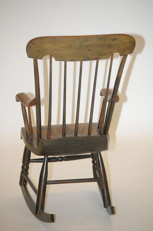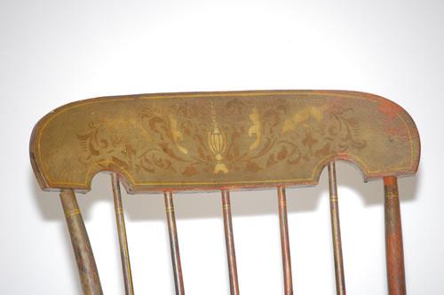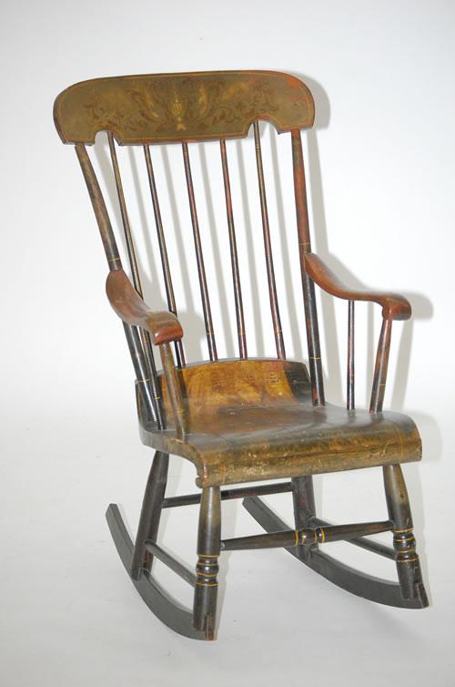 CHILDS PAINTED BOSTON ROCKER - SMALL 19TH CENT. CHILDS ROCKING ARMCHAIR W/ SHAPED CREST, SCROLLED PLANK SEAT, SCROLLED ARMS, TURNED LEGS & STRETCHERS W/ STENCILED PAINT DECORATED CREST & GRAIN PAINTED SEAT - WEAR, CRACKS, IMPERFECTIONS