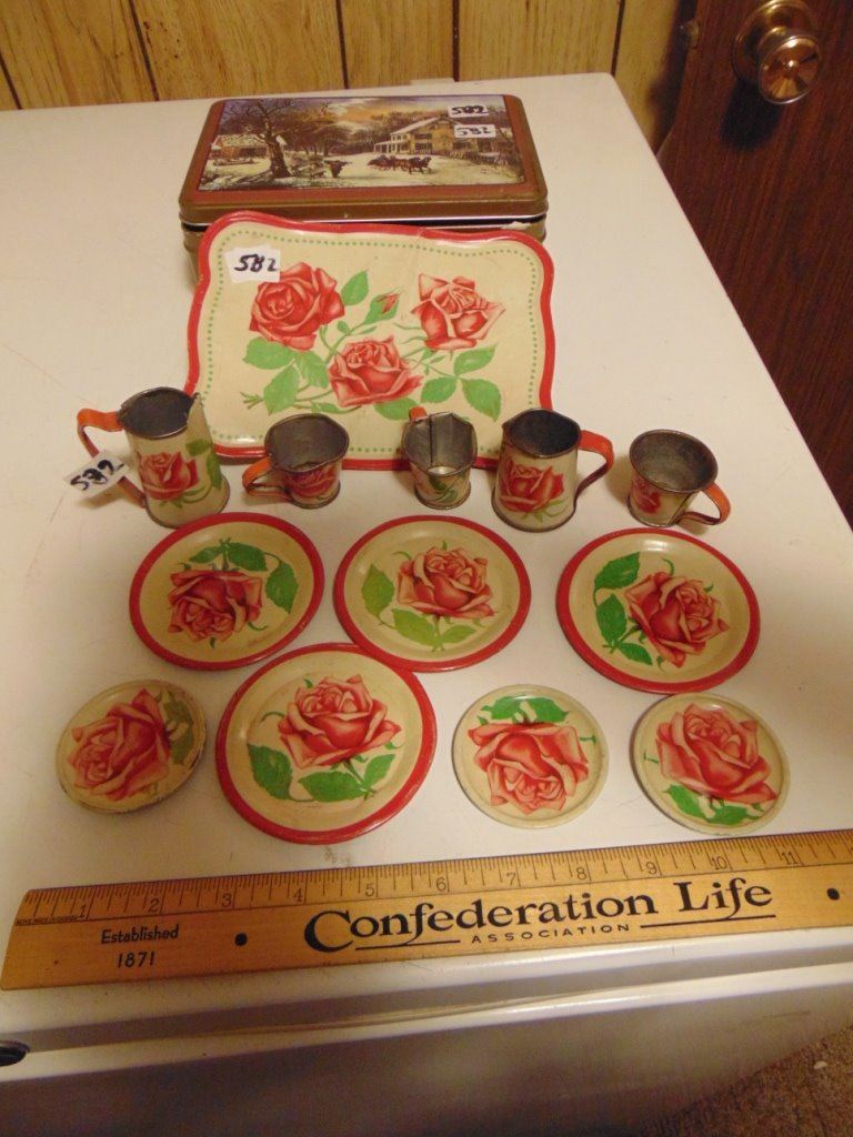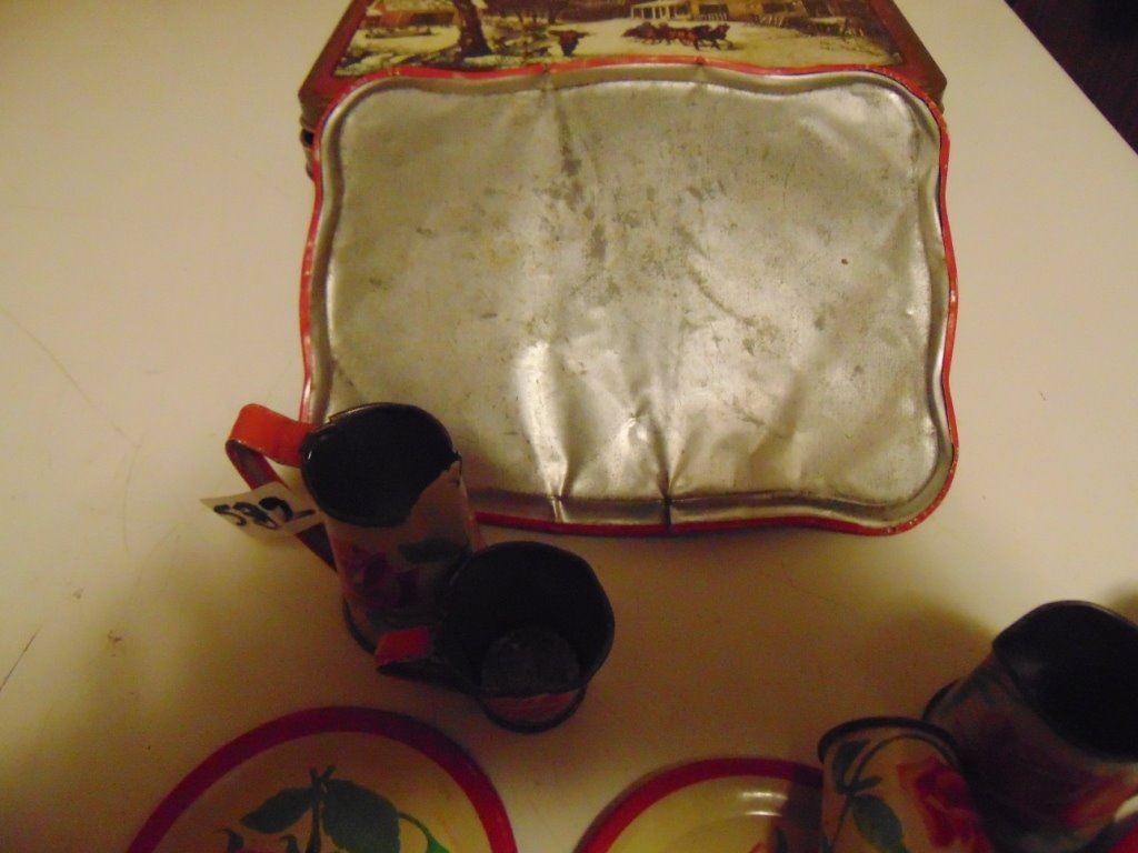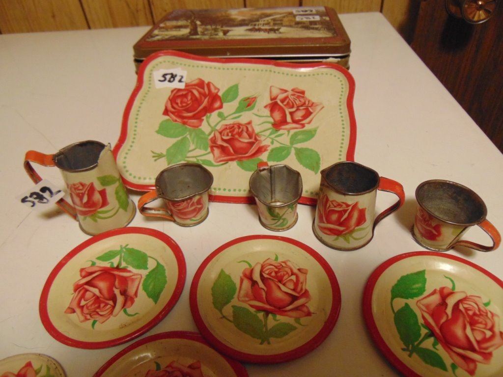 CHILDS' TIN TOY DISHES SET (ROSES PATTERN, LOTS OF PIECES)