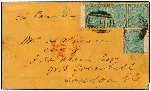 1869 (Jan 29) Cover endorsed ´Via Panama´ to LONDON from COQUIMBO with BRITISH PO cds in black on reverse and franked by Great Britain single and strip of three 1867 1 s. green pl. 4 all tied by C40 obliterators of Coquimbo with LONDON red cds of receipt also on front. Extremely scarce cover and a high 4 s. franking. SG Z49.