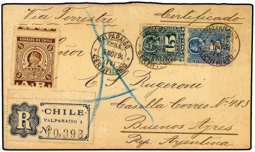 1894 Registered/AR cover to BUENOS AIRES franked by rouletted 1892 5 c. and 15 c. tied by VALPARAISO-REGISTERED cds´s with AR 5 c. chocolate adhesive at left next to registration label. BUENOS AIRES arrival on reverse of scarce cover. (SG 59a, 61, AR77).