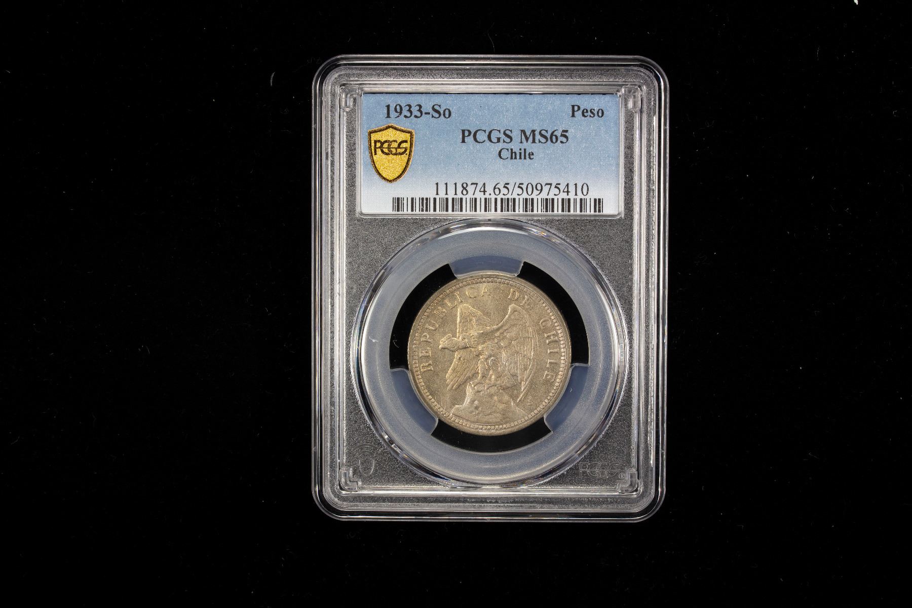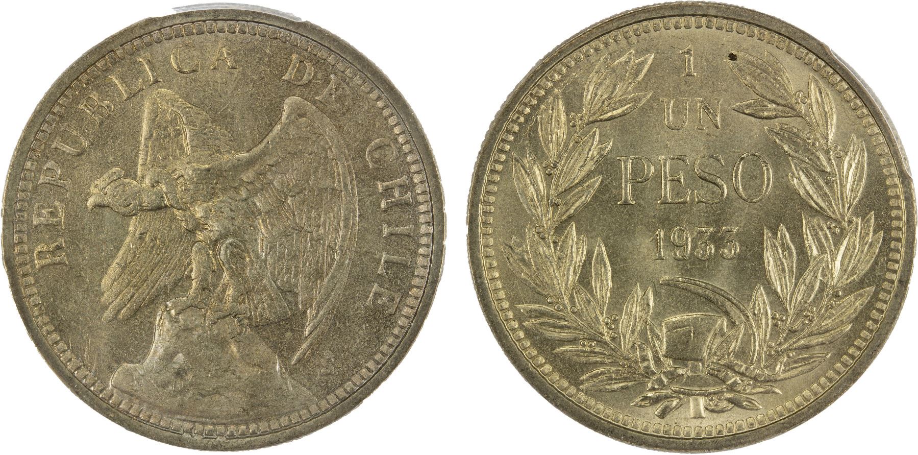 CHILE: Republic, 1 peso, 1933-So, KM-176.1, type without designer's signature, a superb mint state example! PCGS graded MS65.