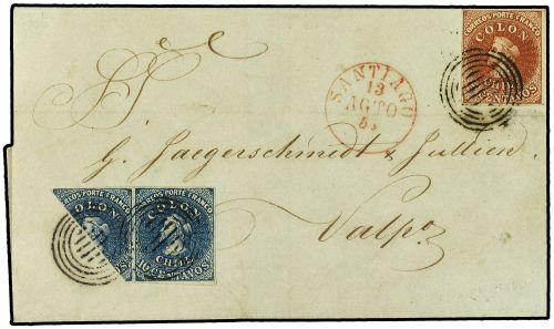 1,2(2) 1855 (13-Agosto) SANTIAGO a VALPARAISO. 5 cts. castaño rojo y 10 cts. azul oscuro pareja con un sello bisectado para hacer un franqueo de 20 ctvos. Pieza de excepcional calidad y muy rara.