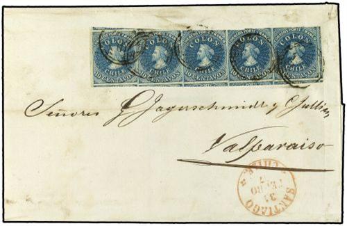 1857 SANTIAGO a VALPARAISO. 10 cents. azul (Yv. 6), tira de cinco, tres grandes márgenes y el superior corto en tres sellos. Espectacular franqueo.