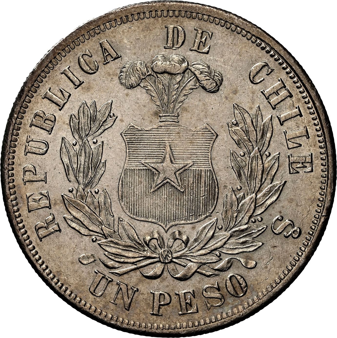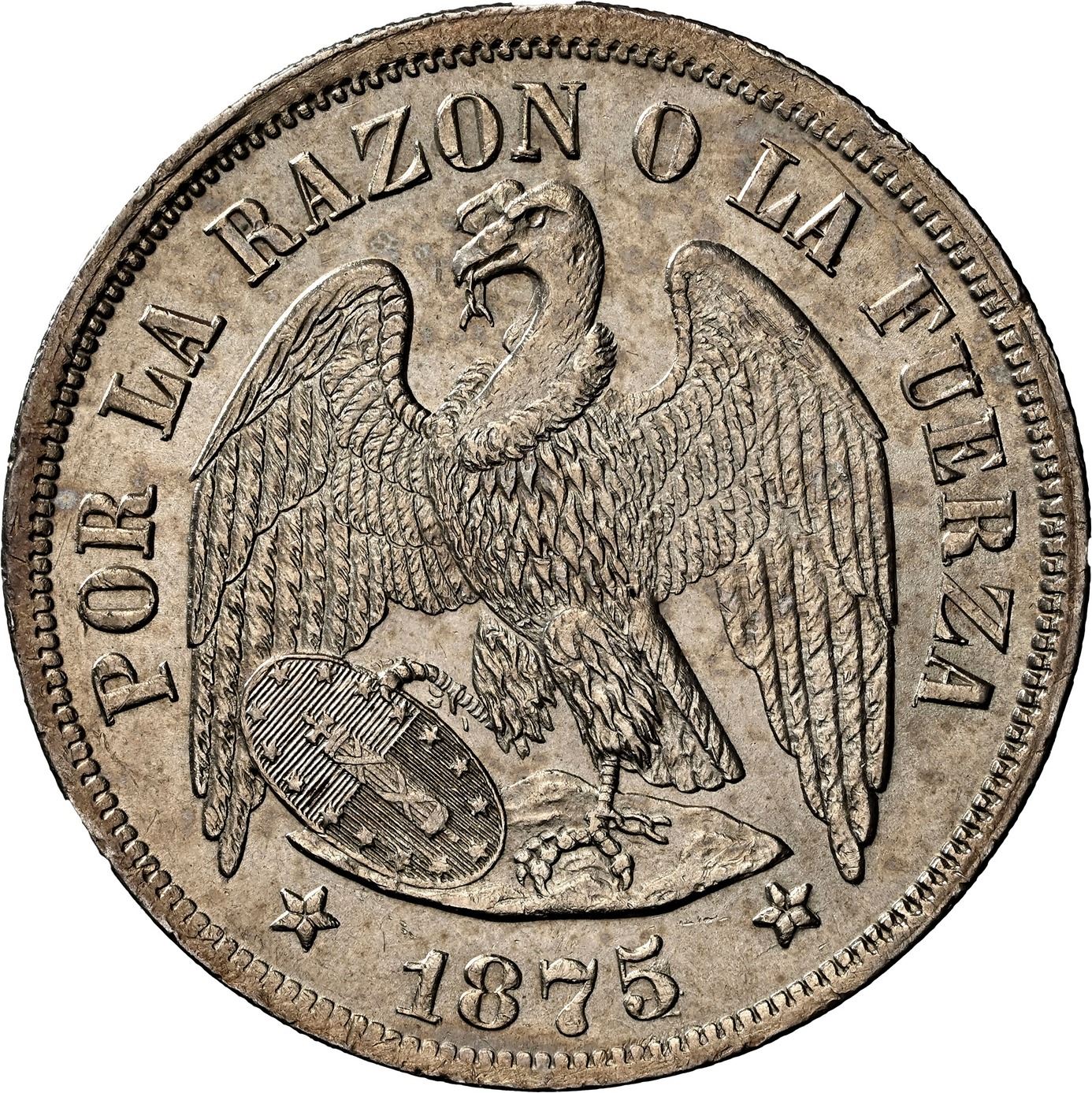 CHILE, Santiago, "condor" peso, 1875/4, NGC MS 62 (Colección Val y Mexía Label). KM-142.1. Light golden toning over typically strong luster, light bagmarks, second highest grade in NGC census. Pedigreed to the Val y Mexía Collection.