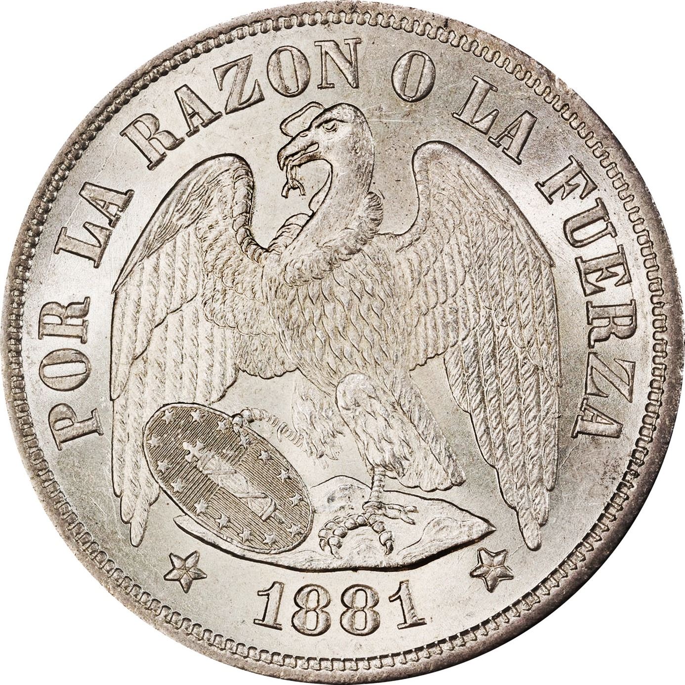 CHILE, Santiago, "condor" peso, 1881, NGC MS 65 (Colección Val y Mexía Label). KM-142.1. Brilliant cartwheel luster with minor die-cracks but no bagmarks, very faint golden surfaces, currently tied with nine others for second finest in NGC census behind a single MS 66. Pedigreed to the Val y Mexía Collection.