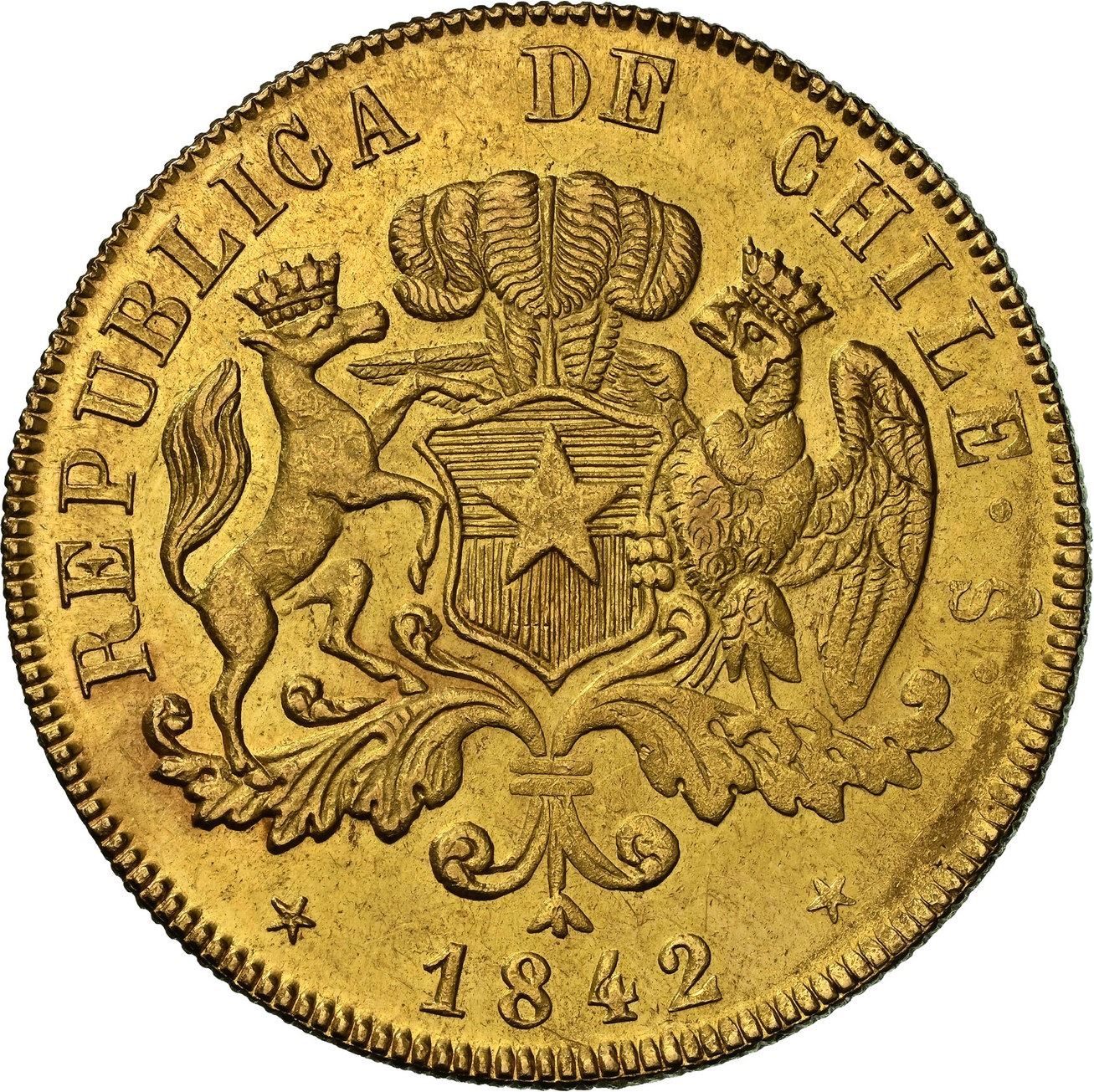 CHILE, Santiago, gold 8 escudos, 1842 IJ, NGC MS 62. KM-104.1; Fr-41. Bold and well-detailed strike in butter-yellow gold with much luster and only minor marks and hairlines, tied with one other for second finest in NGC census behind a single MS 63.