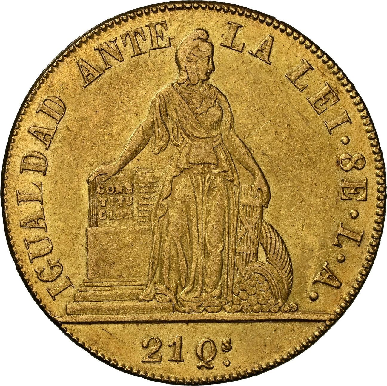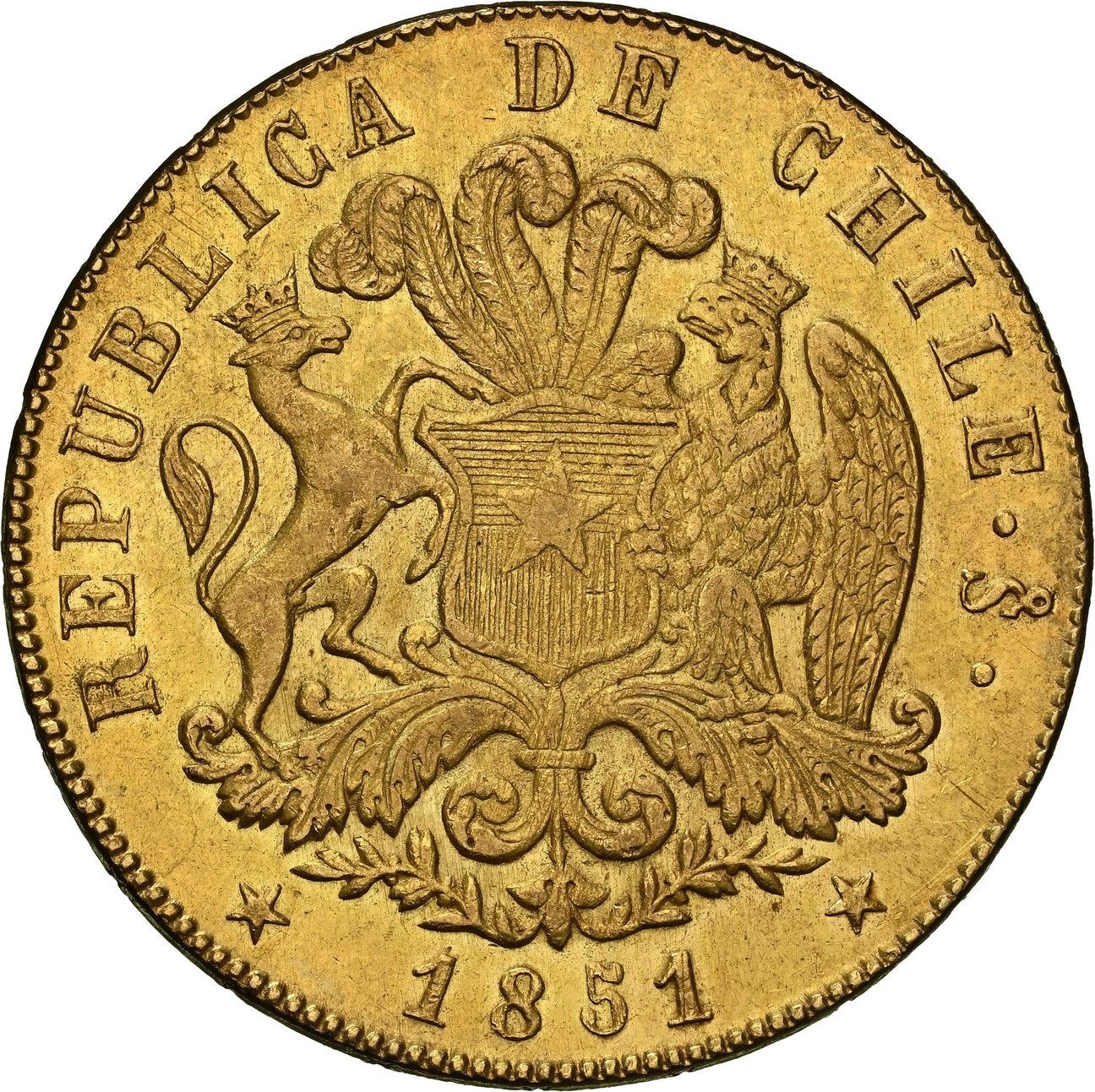 CHILE, Santiago, gold 8 escudos, 1851 LA, ABRIL on edge, NGC MS 61, "top pop." KM-105; Fr-41. Good luster, minimal high-point wear, no marks or hairlines of note, currently tied with four others for finest in NGC census.