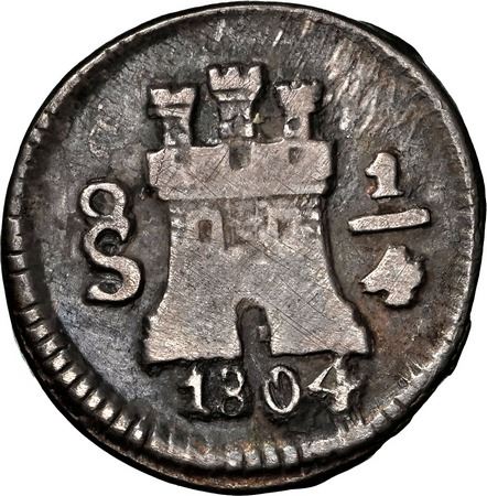 CHILE, Santiago, ¼ real, 1804, NGC F 12 (Val y Mexía Collection Label), finest known in NGC census.