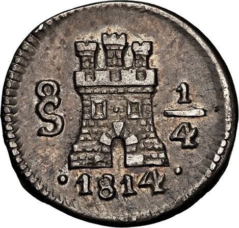 CHILE, Santiago, ¼ real, 1814, NGC AU 53 (Val y Mexía Collection Label).